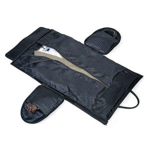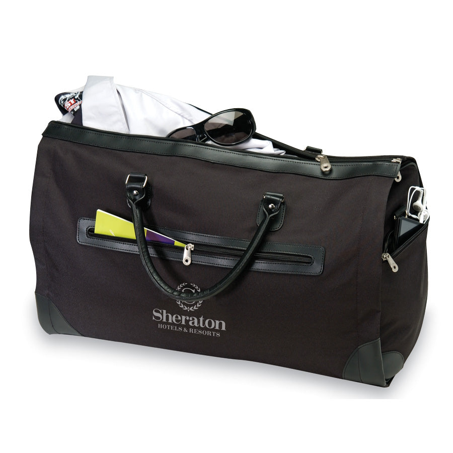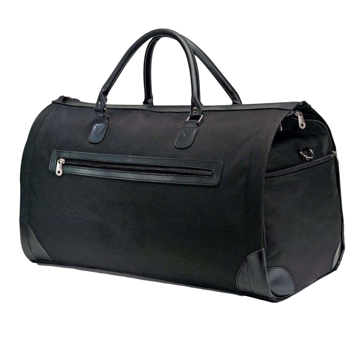 Carry the Elite Travel Duffel Bag that converts into a flat garment bag, calling for easy travel and wrinkle free garments. The exterior has a front and side zippered pockets to keep valuables secured. Fully lined with a smooth finish fabric to protect your clothes. Accented with leatherette carrying handles for a more polished look. Detachable and adjustable for comfortable carrying.