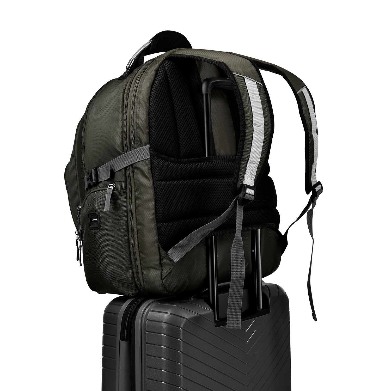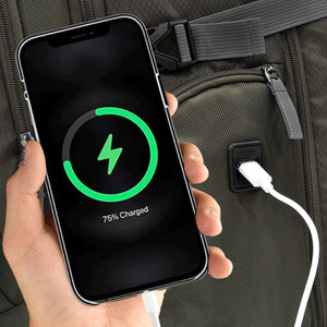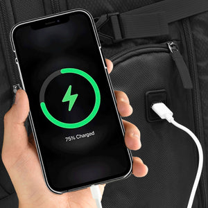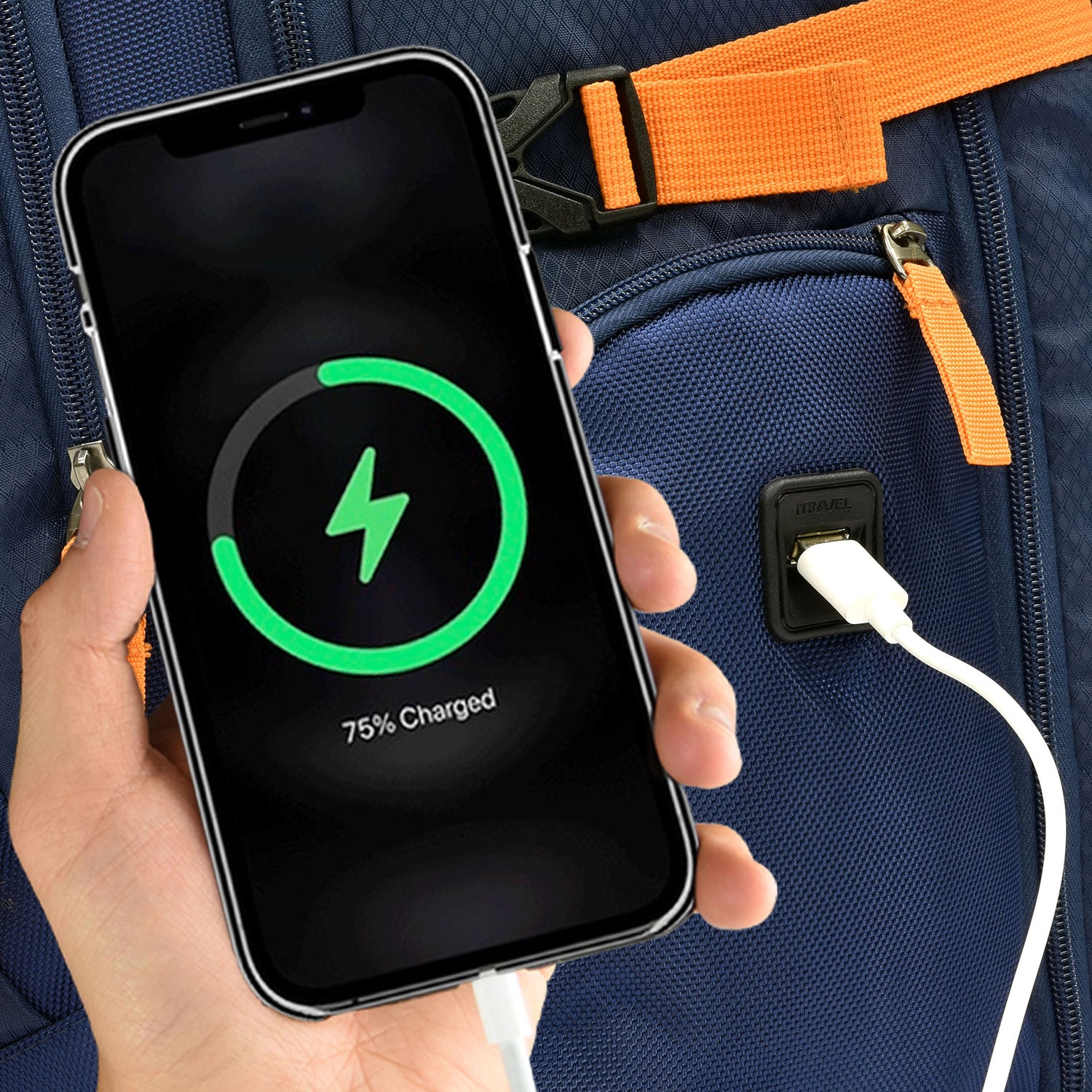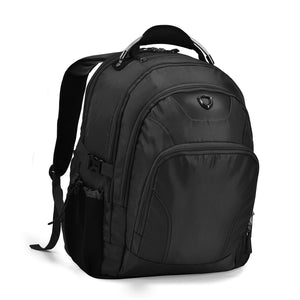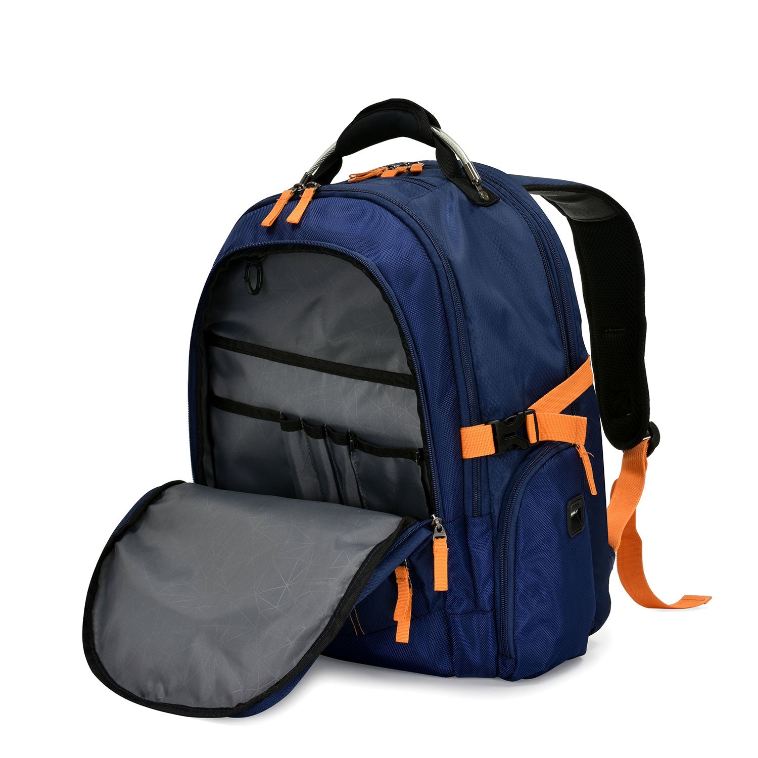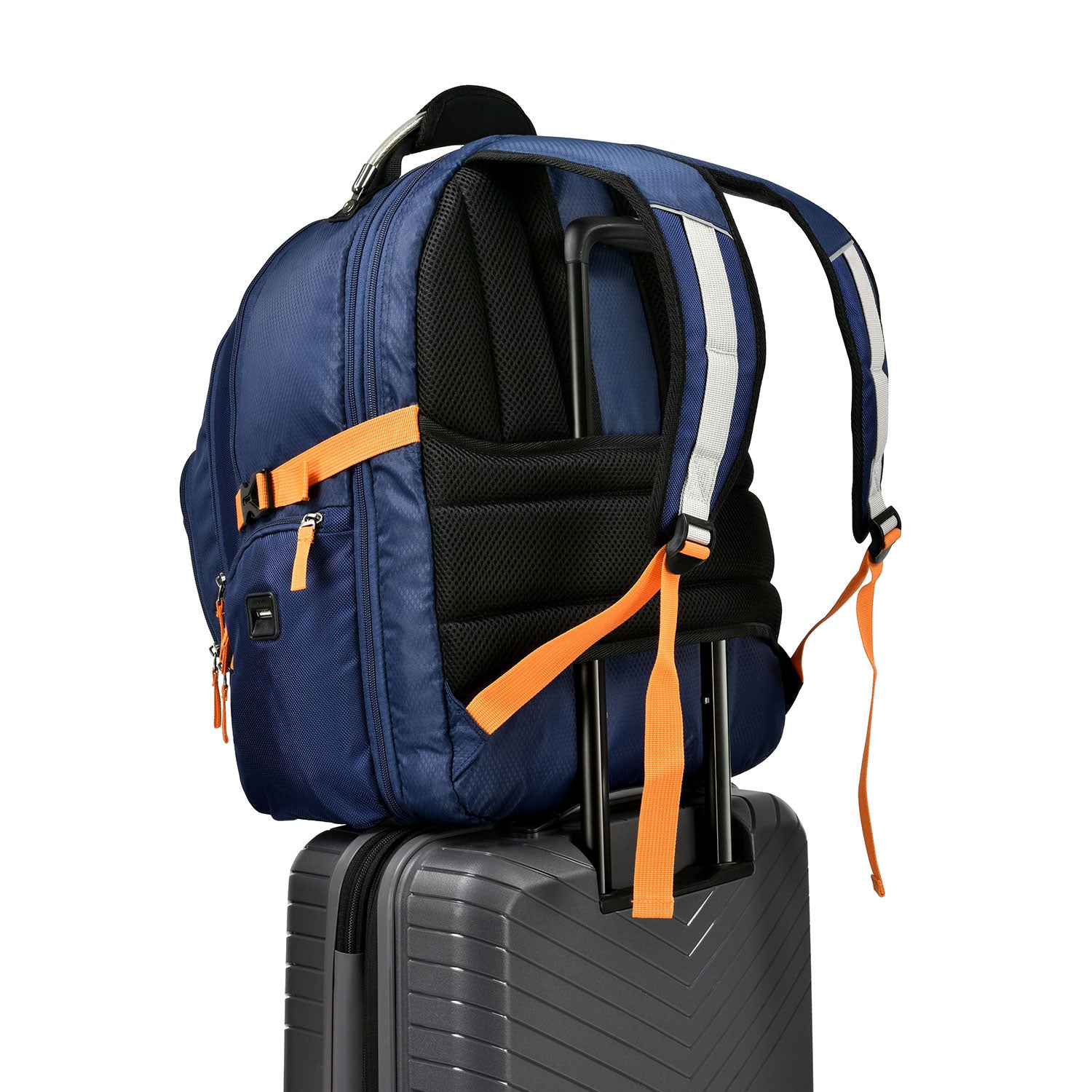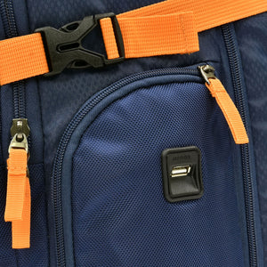 The 19" Hollins Laptop Backpack is a high quality durable backpack perfect for your daily commute or for travels. Secure your laptop or tablet with a padded laptop sleeve along with a micro fleece lined accessory pockets for sunglasses. Steel cable with neoprene padded handle for comfortable carrying. A USB port is built-in on the side to charge small devices (power bank not included).