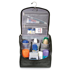 Travel with the Jet-Setter Amenity Kit to bring all your needed travel toiletries. Equipped with a large compartment and zippered pockets inside to organize. Includes a metal hanging hook to hook on at your stay. Top carrying handle made for comfortable carrying.