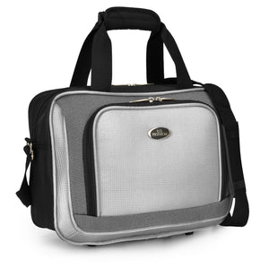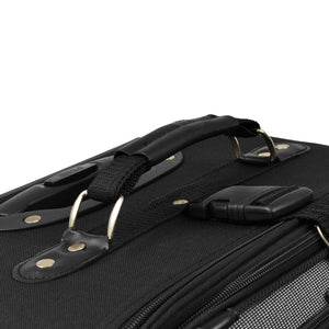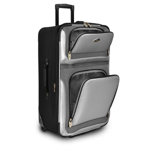 Make a sophisticated statement with the U.S. Traveler New Yorker 4-Piece Rolling Luggage Set. Its lightweight yet durable polyester construction ensures years of reliable use. The suitcases feature an EVA foam front panel to offer a clean look. With one inner zippered mesh pocket and two shoe pockets, you can pack your small essentials conveniently. Dual top- and side-carry handles, and a bottom grip make it easy to carry or lift the bag. The set includes one large-sized suitcase, one small-sized suitcase, and a tote bag.