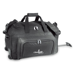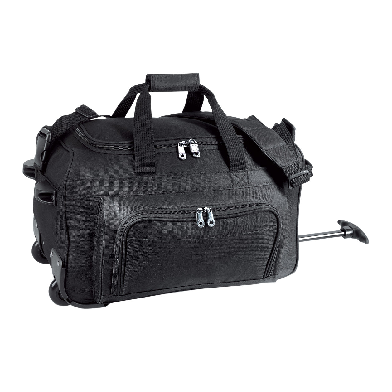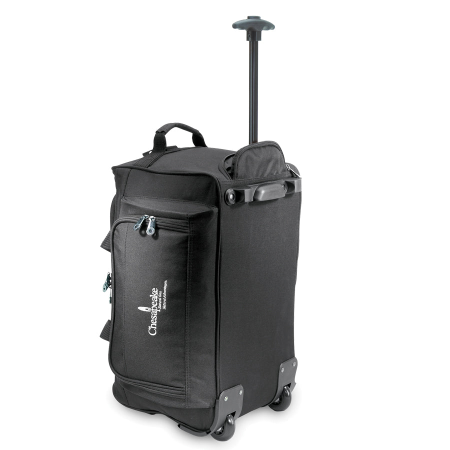 FAA approved carry on, Vanguard rolling duffel bag made of 600 denier polyester with a hideaway pull handle system that locks in-line skate wheels and bottom protectors. Large zippered main compartment, padded carrying handle, and front zippered pocket. Detachable/adjustable padded shoulder strap. Lock included. Great for brand awareness, awards, outdoor and school events.